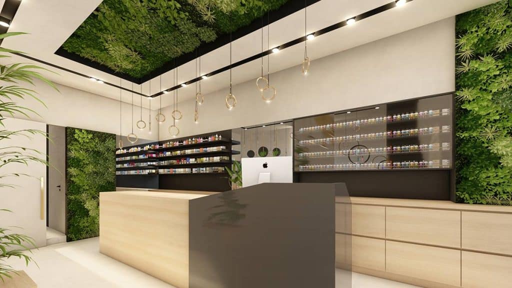 Kako bi prostor dobio karakter vape Shop-a, odabrali smo kružne elemente koji se nižu preko viseće rasvjete i izložbenih polica i asociraju na kružiće dima.