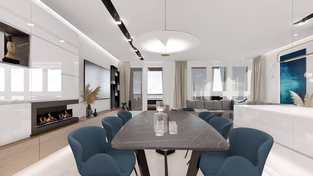 Estetika prostora bila je pažljivo promišljena. Privučeni suvremenim minimalizmom, ali s osjećajem za detalje koji dodaju sofisticiranost, investitori su se odlučili za materijale koji kombiniraju jednostavnost i eleganciju. Uzorci koji podsjećaju na mramor, pronađeni u različitim materijalima poput iverala, keramike i laminama, postali su središnji dio dizajna.