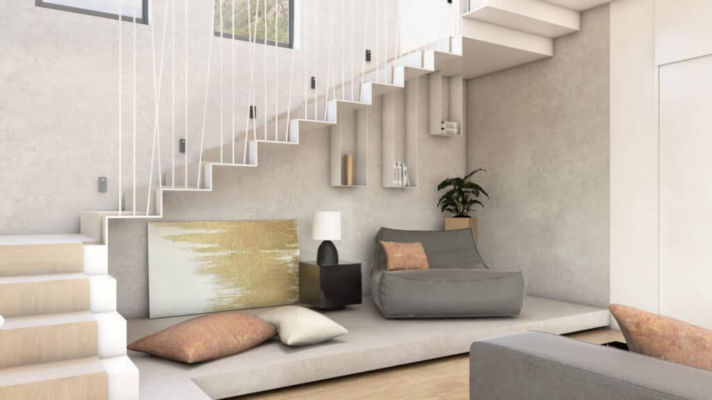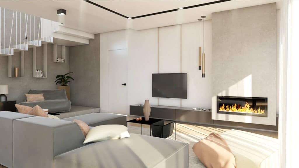Da ne bi dobili pretopao dojam interijera tokom dovoljno toplih, dugih ljetnih dana isti smo mrvicu ohladili unosom sivih i hladnijih bijelih tonova te metalnim detaljima na stubištu i u kupaonicama.