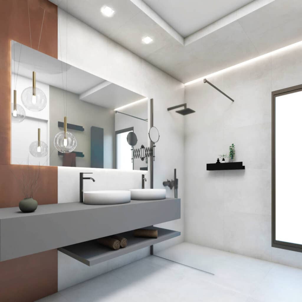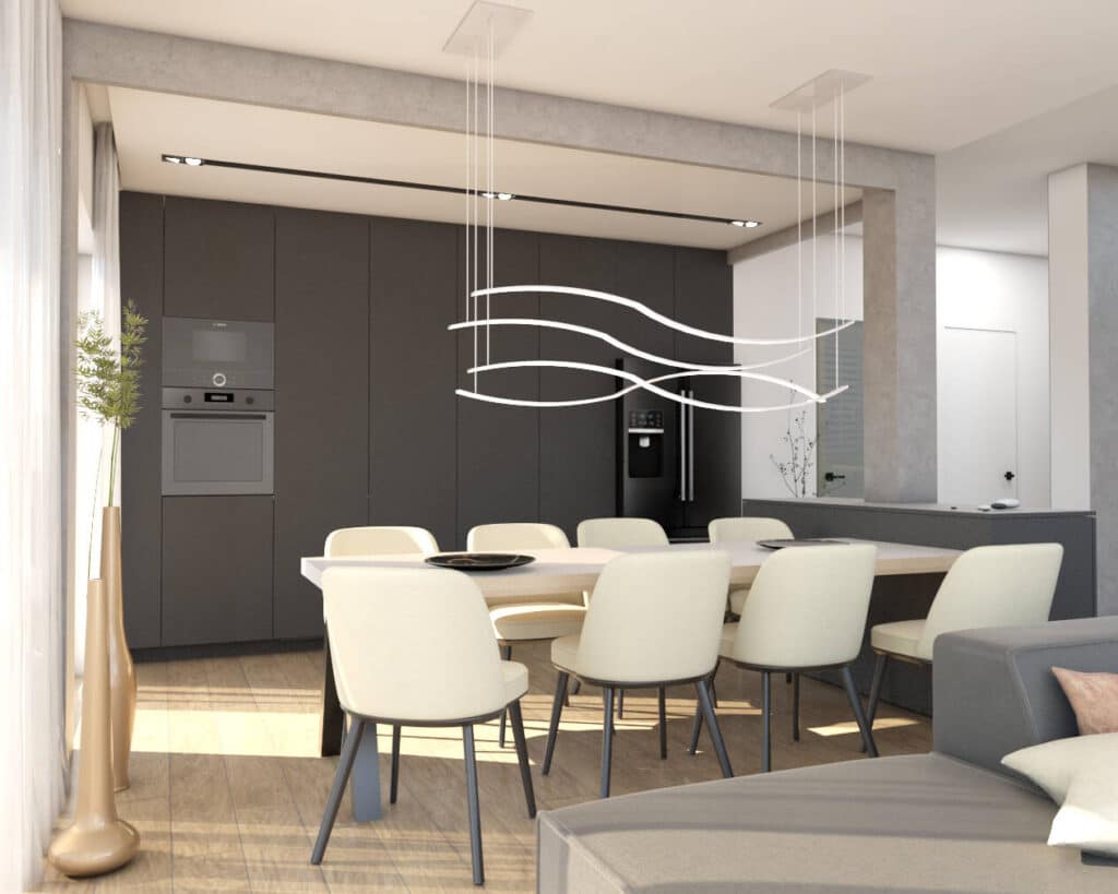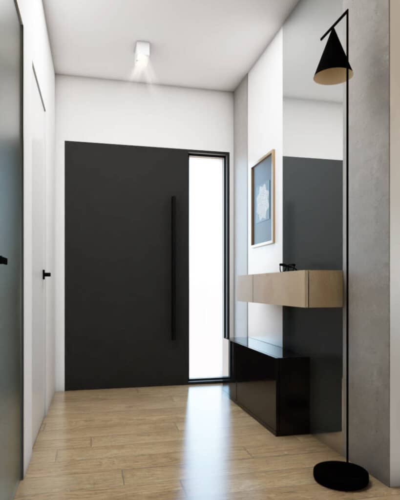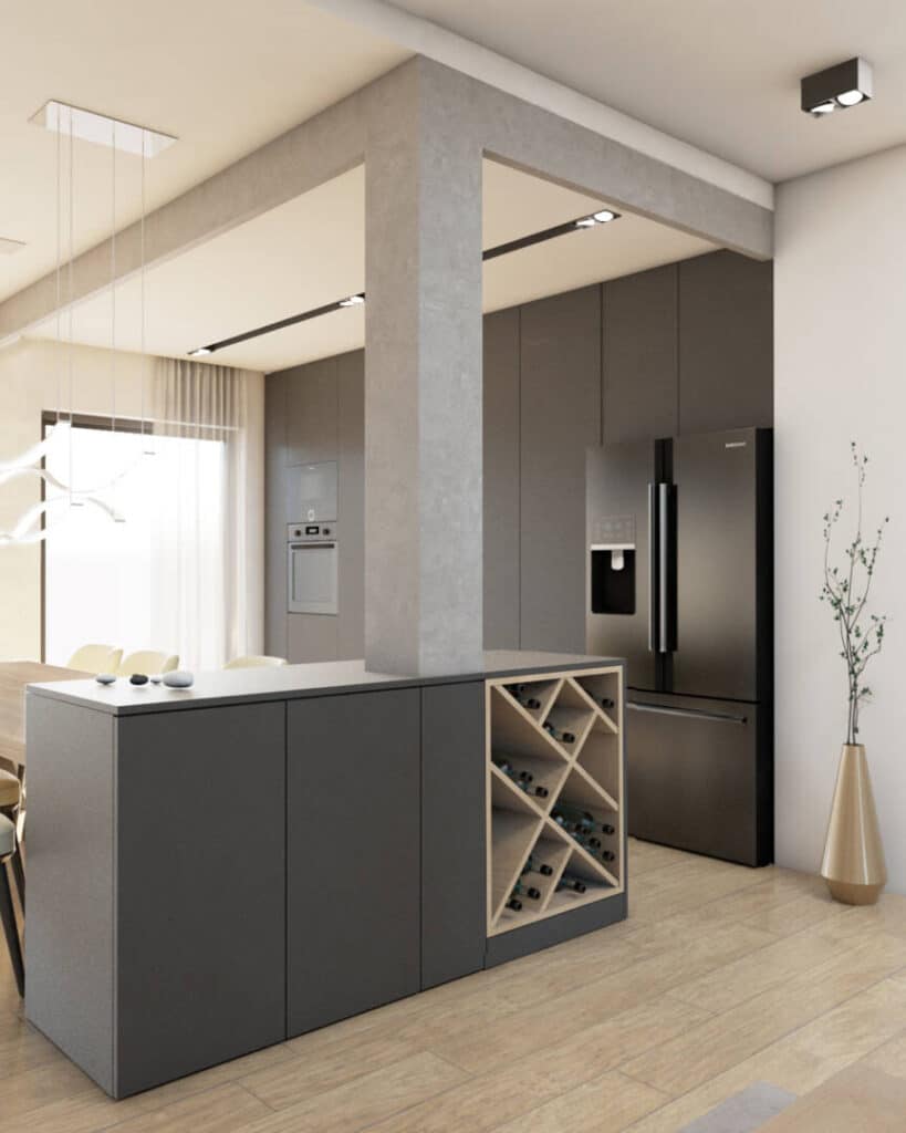 Kroz cijeli interijer i eksterijer postavljene su pločice s uzorkom tamnijeg sivog kamena, a isti se ton boje provlači i kroz stolarski izrađen namještaj te detalje koje život znače, poput ručki na vratima i rasvjetnih tijela (ne želimo si vizualizirati noćni odlazak do hladnjaka bez prethodno navedenih).
