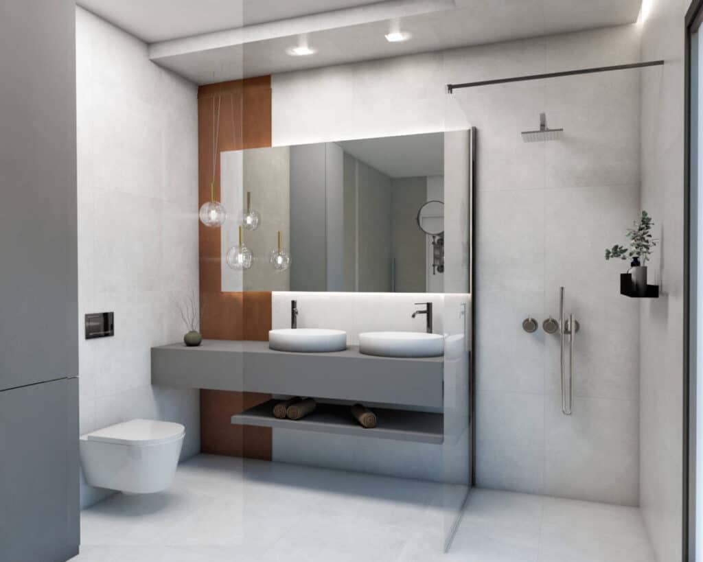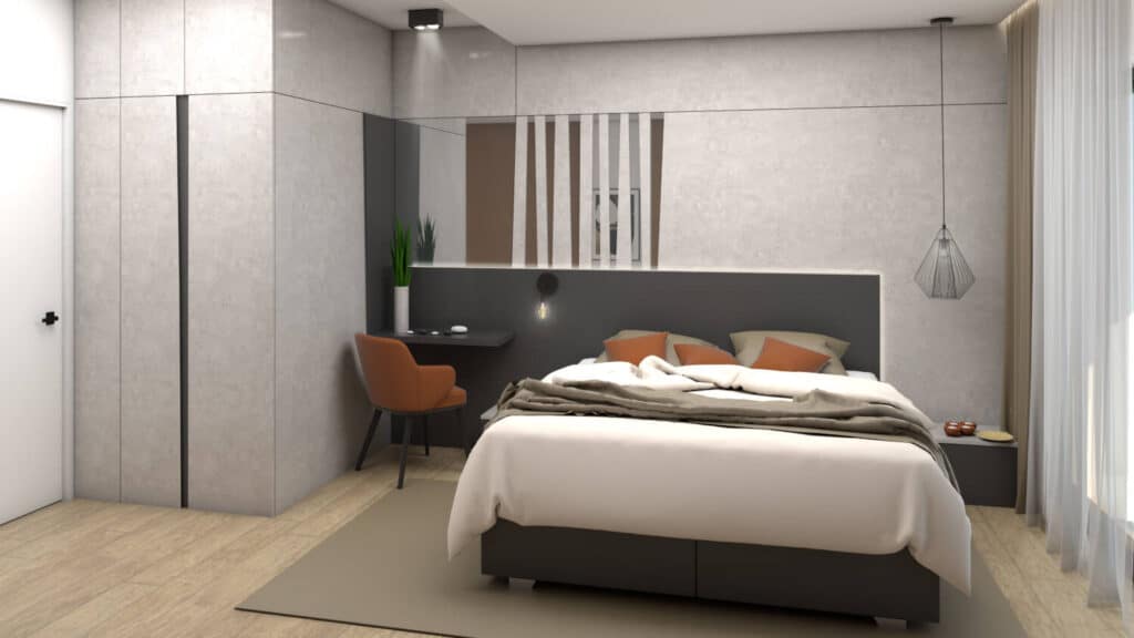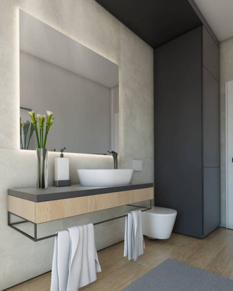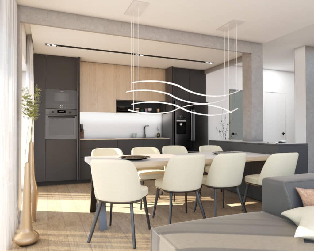 Kroz cijeli interijer i eksterijer postavljene su pločice s uzorkom tamnijeg sivog kamena, a isti se ton boje provlači i kroz stolarski izrađen namještaj te detalje koje život znače, poput ručki na vratima i rasvjetnih tijela (ne želimo si vizualizirati noćni odlazak do hladnjaka bez prethodno navedenih).