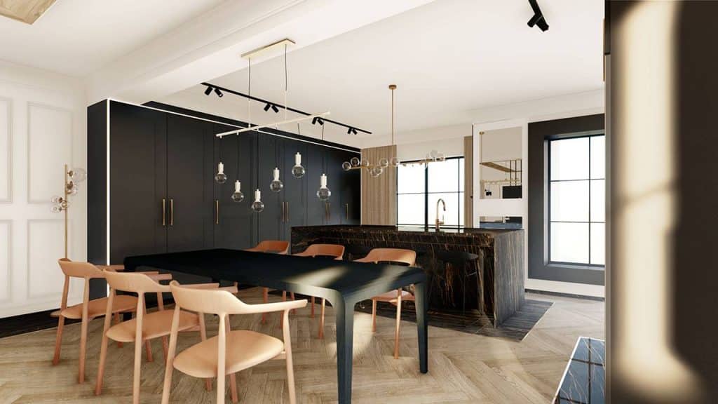 U prizemlju je smješten open space koji je u tamnijim tonovima i kožnim akcentima. Ufrezane fronte i profilacije rade spoj u cijeloj kući. U kuhinjskom dijelu su visoki ormari te otok u istim pločama kao i ostatak open space-a te se na taj način savršeno povezala s ostatkom prostora. Velike tamne ploče uz stepenice prelaze u gornju etažu. Toplinu prostora dobilo se sa postavljanjem visećeg kamina u dijelu dnevnog boravka. Uz open space u prizemlju je također smještena i jedna spavaća soba sa vlastitom kupaonicom, gostinjska kupaonica, izba te vešeraj.