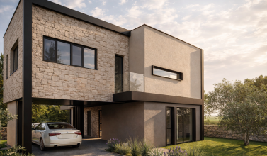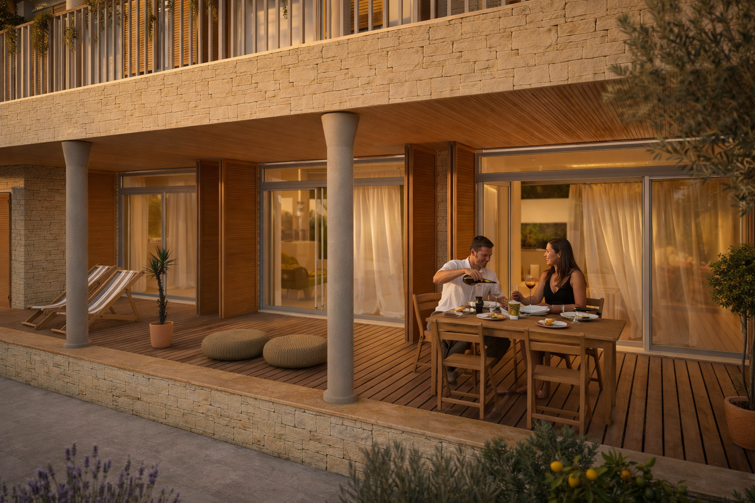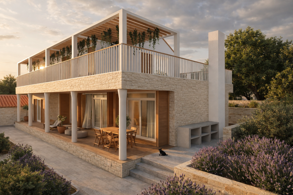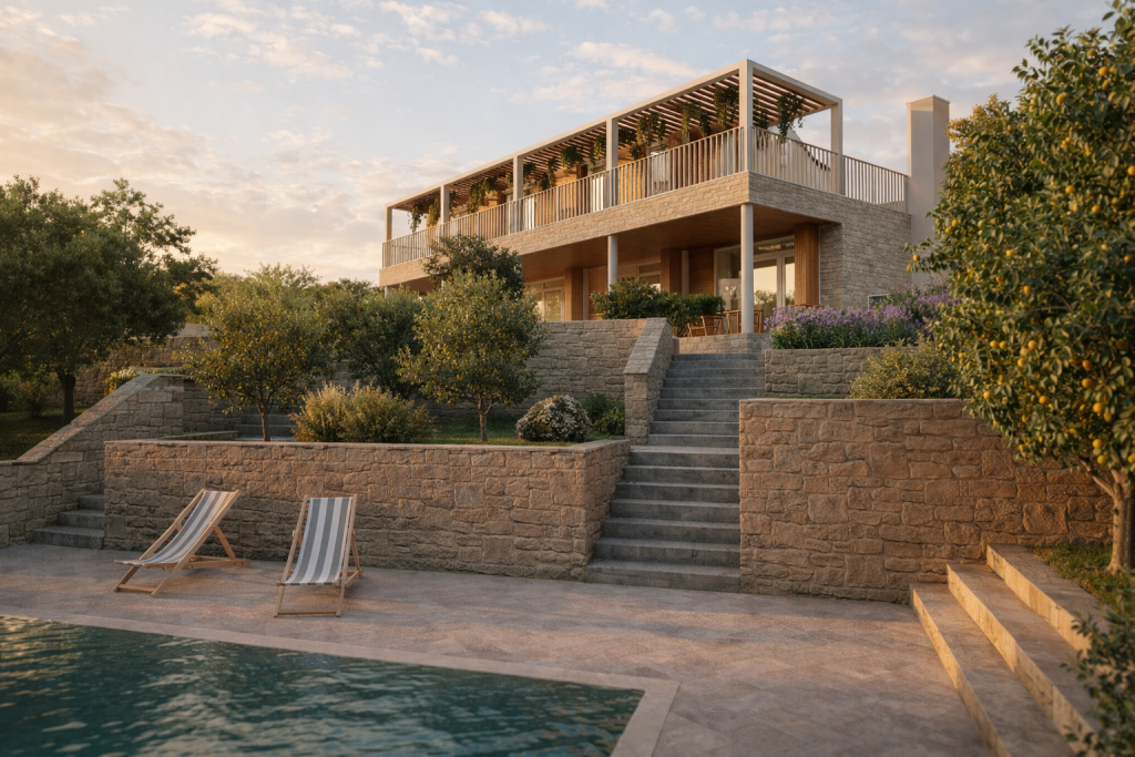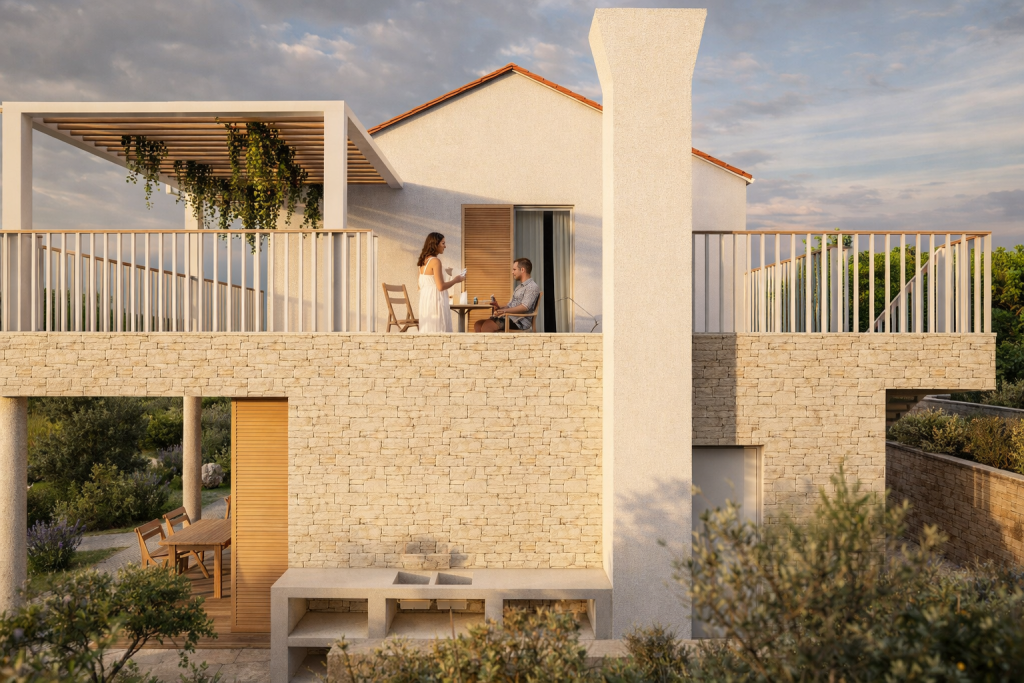 Materijalnost projekta oslanja se na lokalni kontekst: kamen kao osnovni nositelj volumena, drvo kao element topline i taktilnosti te svijetle žbukane površine koje reflektiraju mediteransko svjetlo. Kombinacijom tih elemenata postiže se ravnoteža između suvremenog izraza i ambijentalne uklopljenosti.