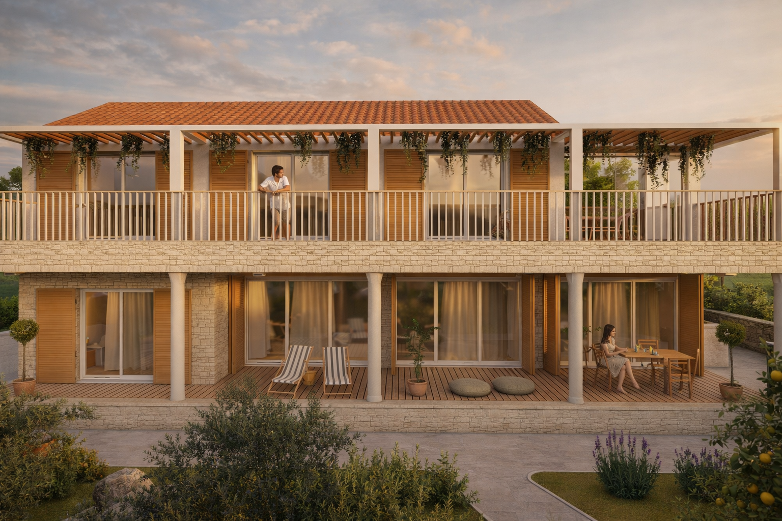 Kat je koncipiran kao mirnija, privatnija zona s nizom spavaćih soba povezanih zajedničkom terasom. Pergola koja se proteže cijelom dužinom pročelja definira ritam prostora i filtrira svjetlo, stvarajući ugodnu igru sjene tijekom dana. Vanjski hodnik nije samo komunikacija, već produžetak životnog prostora – mjesto boravka, pogleda i svakodnevnih rituala.